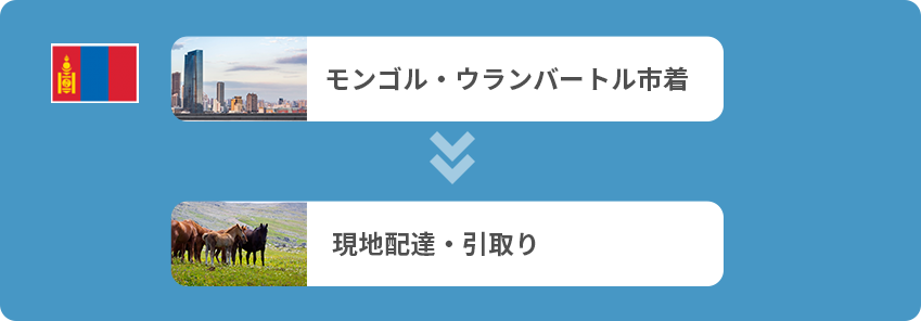 (注)大阪からウランバートルへの輸送は、中国の港や、中国とモンゴルの国境を経由する海上と鉄道の複合輸送です。 天候その他様々な理由でウランバートル到着が遅れることがありますのでご了承下さい。